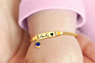 This highly polished, hypoallergenic steel bracelet with gold ion plating offers lasting durability and elegant style for babies and young children aged 3 months to around 5 years. Measuring from 12cm to 15cm, it adjusts to grow with your child’s wrist. The gold IP (ion plating) combines a titanium nitride base with a 14k gold layer, creating a finish that is both chemically stable and resistant to wear, ensuring a “permanent” shine. Featuring a beautiful blue cubic zirconia charm, this engravable bracelet makes a meaningful, personalized gift. Also available with a pinky CZ charm for variety. Please note the red charm shown in photos is not currently offered.