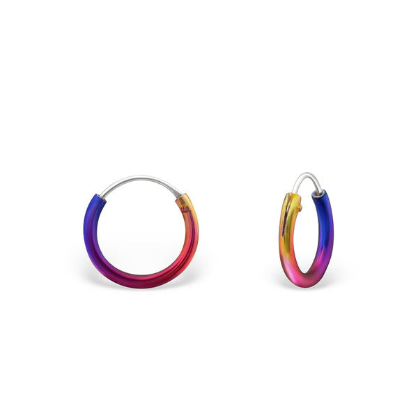 Sterling Silver sleeper earrings for babies and toddlers, from newborn, these rainbow sleepers, just 10mm, are suitable for the smallest of ears. Tubular for strength, these lightweight and comfortable earrings will last her through her first year - 18 months.