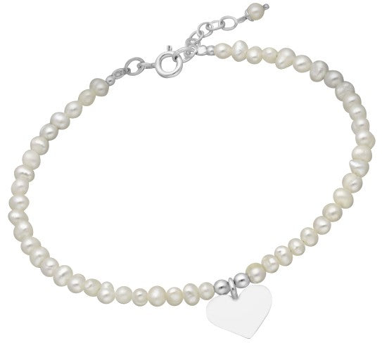 Children's and Teens' Bracelets: Sterling Silver, White, Freshwater Pearl Bracelets with Engravable Heart Charm and Gift Box