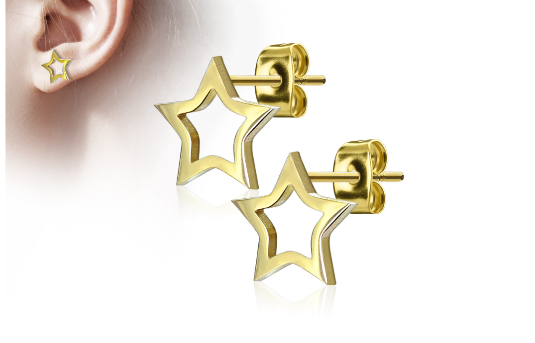 Measuring 9mm, these surgical steel, gold IP open stars will shine on the ears of your star. Would suit older girls and teens.