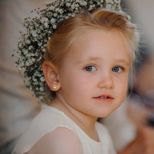 Exquisite little earrings, 6mm x 6mm, suitable perhaps for ages 3 - 8, these 14K yellow gold over sterling silver cz heart on heart earrings are destined to become her favourites! Hallmarked 925. Terrible photo, beautiful earrings. Want two pairs? Purchase two pairs and enjoy our Sister Special and get 10% off both pairs.