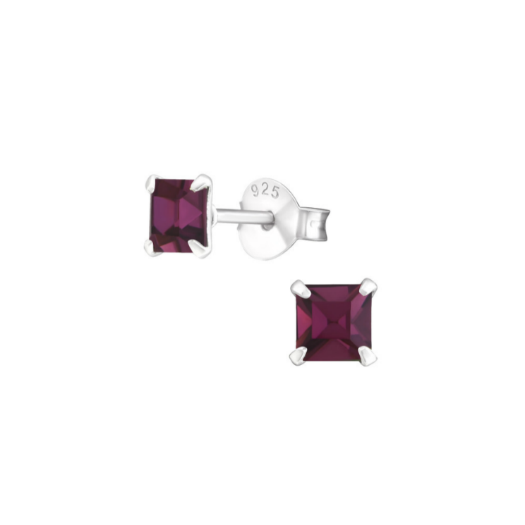Children's Earrings - Sterling Silver Four Prong, 4mm Princess Cut, Amethyst CZ Studs