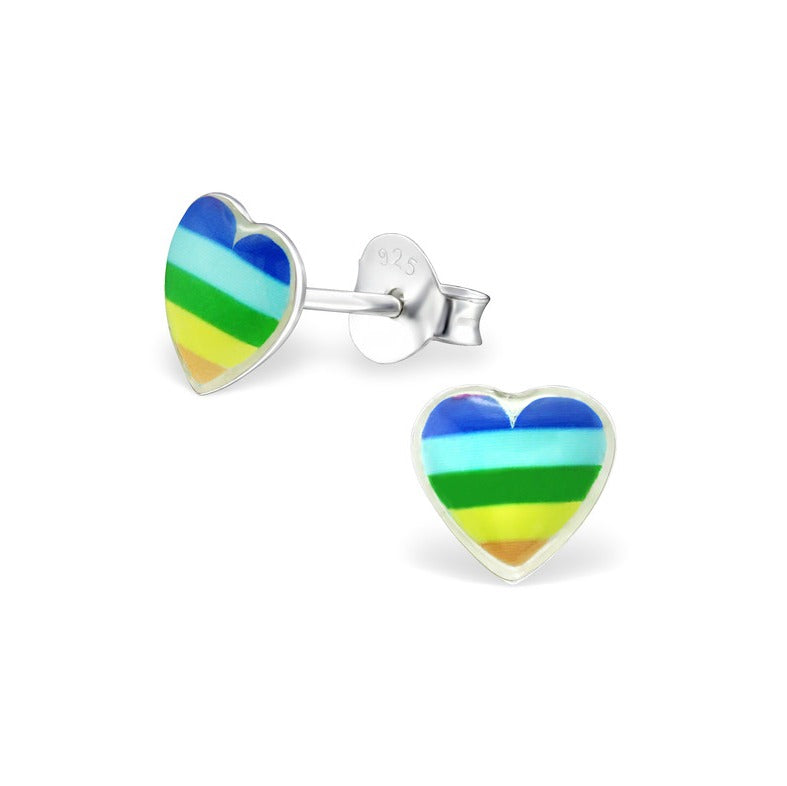 Sterling silver children's heart earrings from our Bright Hearts collection. Measuring 7mm x 7mm, they feature bright rainbow stripes on kids' heart earrings.Want two pairs? Purchase two pairs and enjoy our Sister Special and get 10% off both pairs.