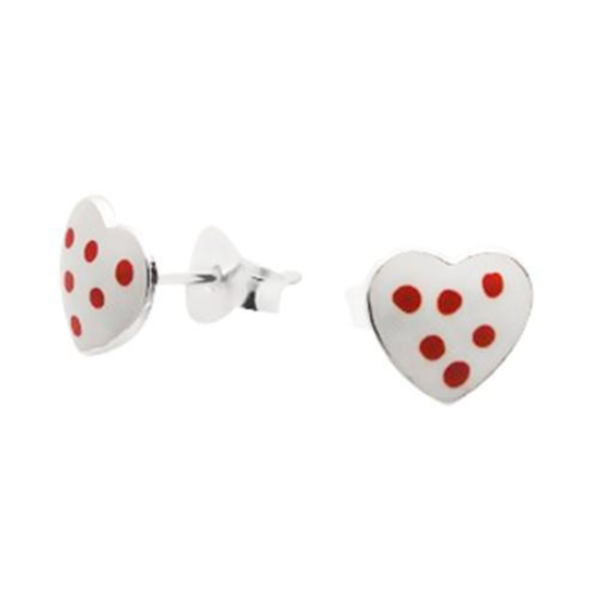 White with red dots, sterling silver heart earrings suited for little girls over the age of 3 or 4. Hearts measure 8mm x 7mm. These quirky children's earrings are hallmarked.
