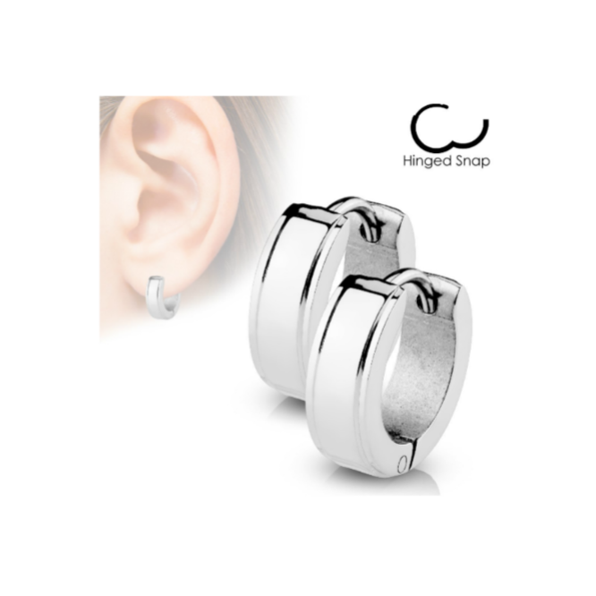 Highly polished, look like sterling silver, for the most sensitive skin, our hypoallergenic surgical steel huggies measure 8mm internal dia. and a chunky 5mm wide. They are banded along the edges but otherwise unadorned. Great every-day-wear earrings for children perhaps over 6.