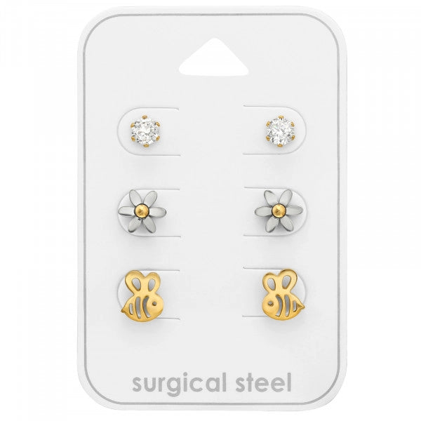 Children's Earrings: Surgical Steel Set of 3 Prs of Bee, Flower and CZ Stud Earrings - Age 4 - Teens with Gift Box