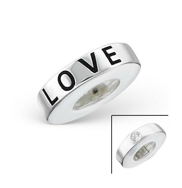 Simple, solid, sterling silver spacer bead stamped with the letters L O V E, and with cz for sparkle, measuring 11mm x 3mm wide.