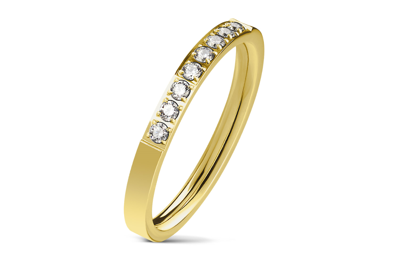 Stunning, premium ring with sparkling cz. Also available in surgical steel, and yellow gold IP. What is IP Gold? Ion plating makes the gold plating more durable, more wear resistant, and also has a higher brightness. Ion plating involves adding of a titanium nitride layer, which has a high chemical stability, to the component to be plated. To this is added a gold coating, normally not exceeding 0.3 urn in thickness. It is considered so durable as to be permanent. Please choose size from the drop down box.