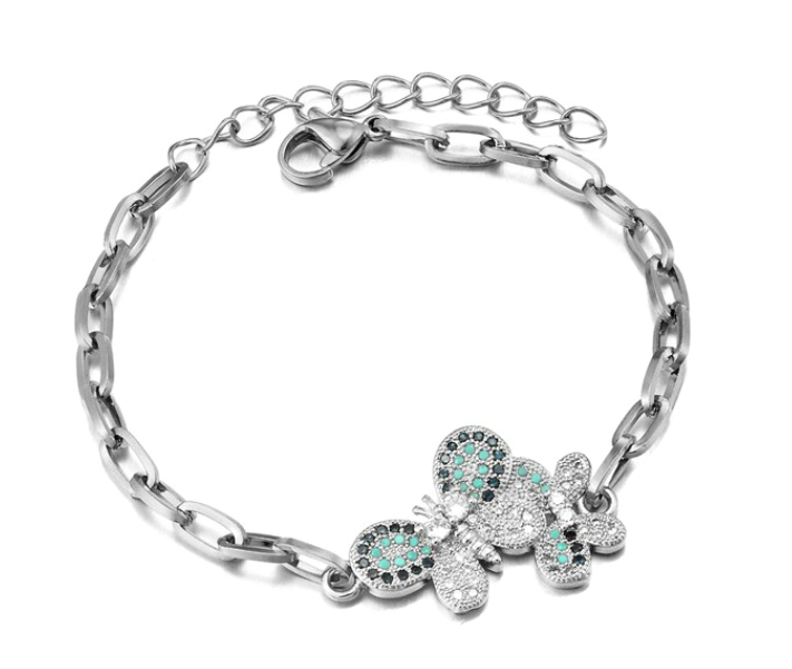 Hypoallergenic surgical steel for super-sensitive children and young adults, this 16.5cm bracelet has a 3cm extension and should fit most children from perhaps age 8 to teens. Butterflies measure 2cm and 1.5cm and are micro-embedded with clear, blue and dark blue cz.